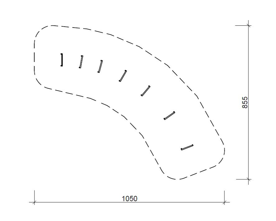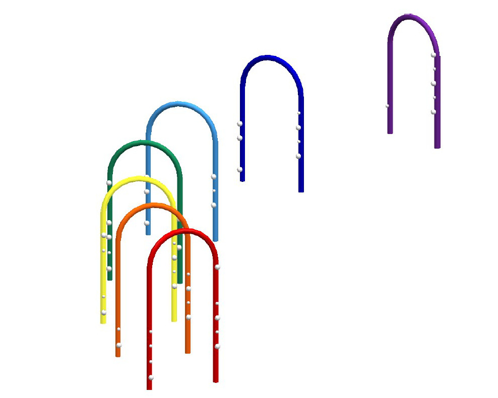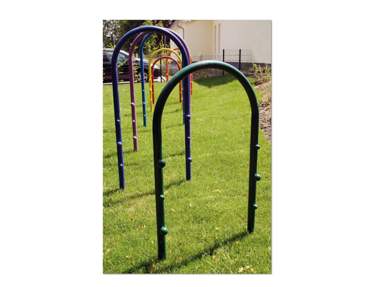 1 Satz bestehend aus 7 Bögen aus Stahlrohr ø 48 mm, verzinkt und pulverbeschichtet in Regenbogenfarben (rot, orange, gelb, grün, hellblau, dunkelblau, violett) in unterschiedlichen Höhen eingebaut, mit angeschweißten Greifkugeln ø 3-5 cm. Die Positionierung der Bägen zueinander ist bei der Aufstellung frei wählbar. Generell gilt für jeden Bogen ein Mindestraum (die Mindesträume der Bägen dürfen sich untereinander überschneiden) von 150 cm umlaufend.