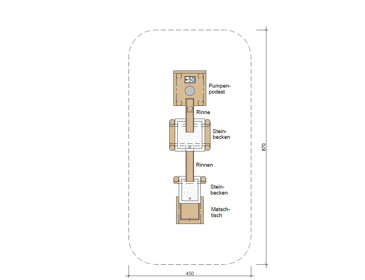 1 Matschtisch ca. 100 x100 cm, Bodenfläche aus ca. 40 mm Eichebrettern, seitliche Aufkantungen ca. 30 mm, Matschtische mit einer Abflussöffnung und einem Eichenstopfen