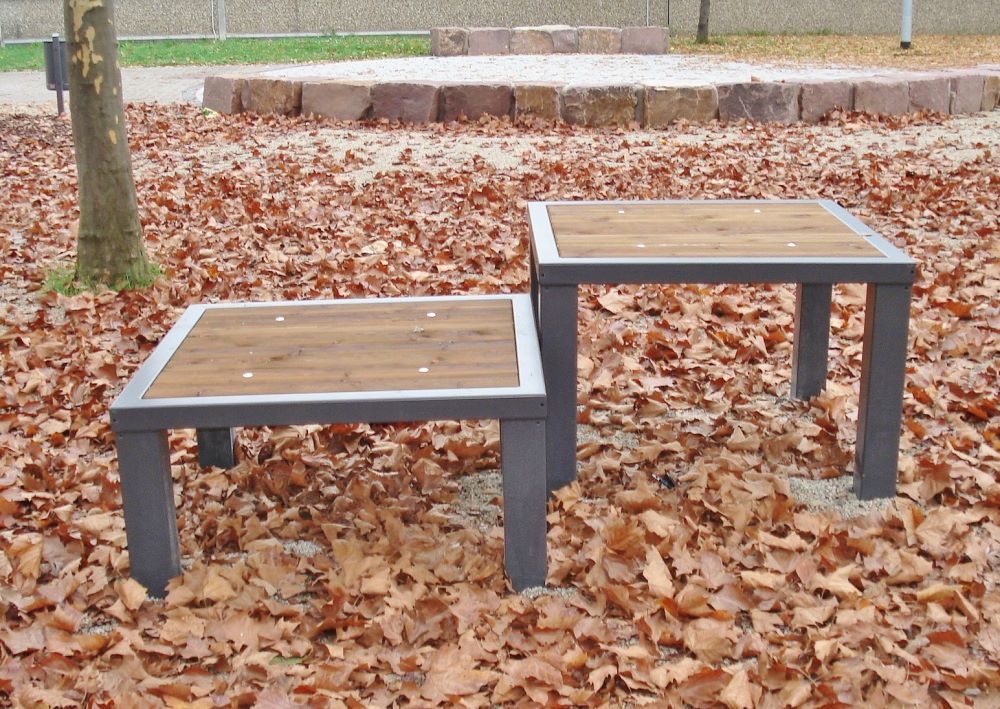 Podest mit Metallrahmen und Metall-Standpfosten 10 x 10 cm, feuerverzinkt und nach allen gängigen RAL-Farbtönen pulverbeschichtet, Auflage aus 40 x 100 mm Douglasiebretter, geriffelt, lasiert.