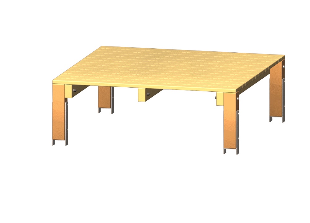 Podest mit 4 Standpfosten aus Vierkantholz 10x10 cm, Auflage aus Blockbohlen 30x100 mm, gehobelt, Kanten gefast, chromfrei kesseldruckimprägniert braun, inkl. verz. Pfostenankern.