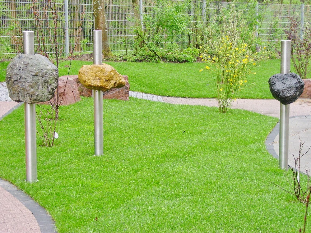 Spielobjekt mit um Vertikalachse drehbar gelagertem Naturstein, Größe ca. 30/40/50 cm mit Kernbohrung ø 100 mm zur Aufnahme von Distanzhülsen und Tragsäule, Drucklager und Spezial-Kunststoffgleitbuchsen; Tragsäule aus Edelstahl-Rundrohr ø 88 mm mit Bodeneinstand zum Einbetonieren.
