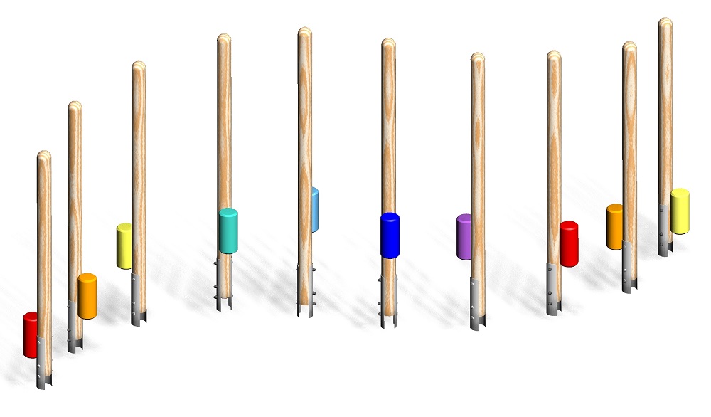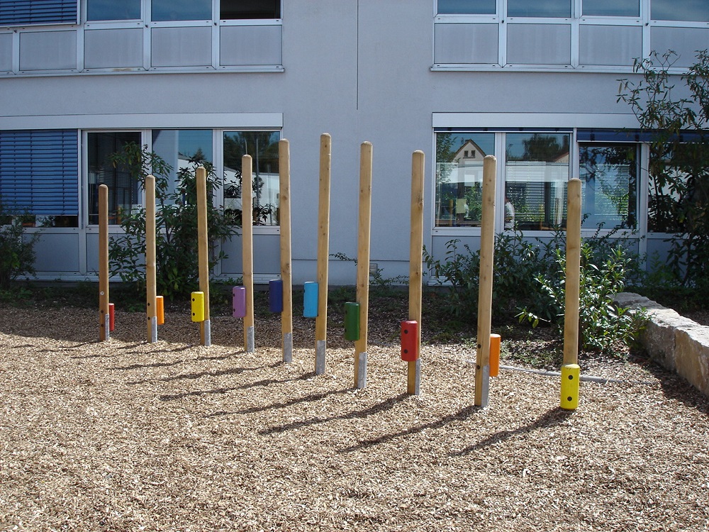Parcourshölzer aus kerngetrennten, zylindrisch gefrästen Rundhölzern; Stelzen ø 10 cm, Rundkopffräsung, chromfrei kesseldruckimprägniert braun, inkl. verz. Pfostenanker; Tritthölzer ø 13 cm, in der Höhe abgestuft, verschiedenfarbig lackiert.