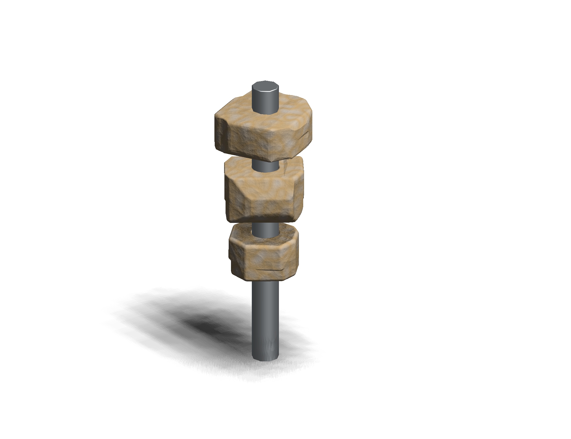 Spielobjekt mit 3 um die Vertikalachse drehbar gelagerten Natursteinen, übereinander angeordnet, ø ca. 30 cm, mit Kernbohrung zur Aufnahme von Tragrohr und Kunststoffgleitlager, Tragsäule aus Edelstahl-Rundrohr ø 42 mm mit Bodeneinstand zum Einbetonieren, Fußplatte zum Aufdübeln auf Anfrage.