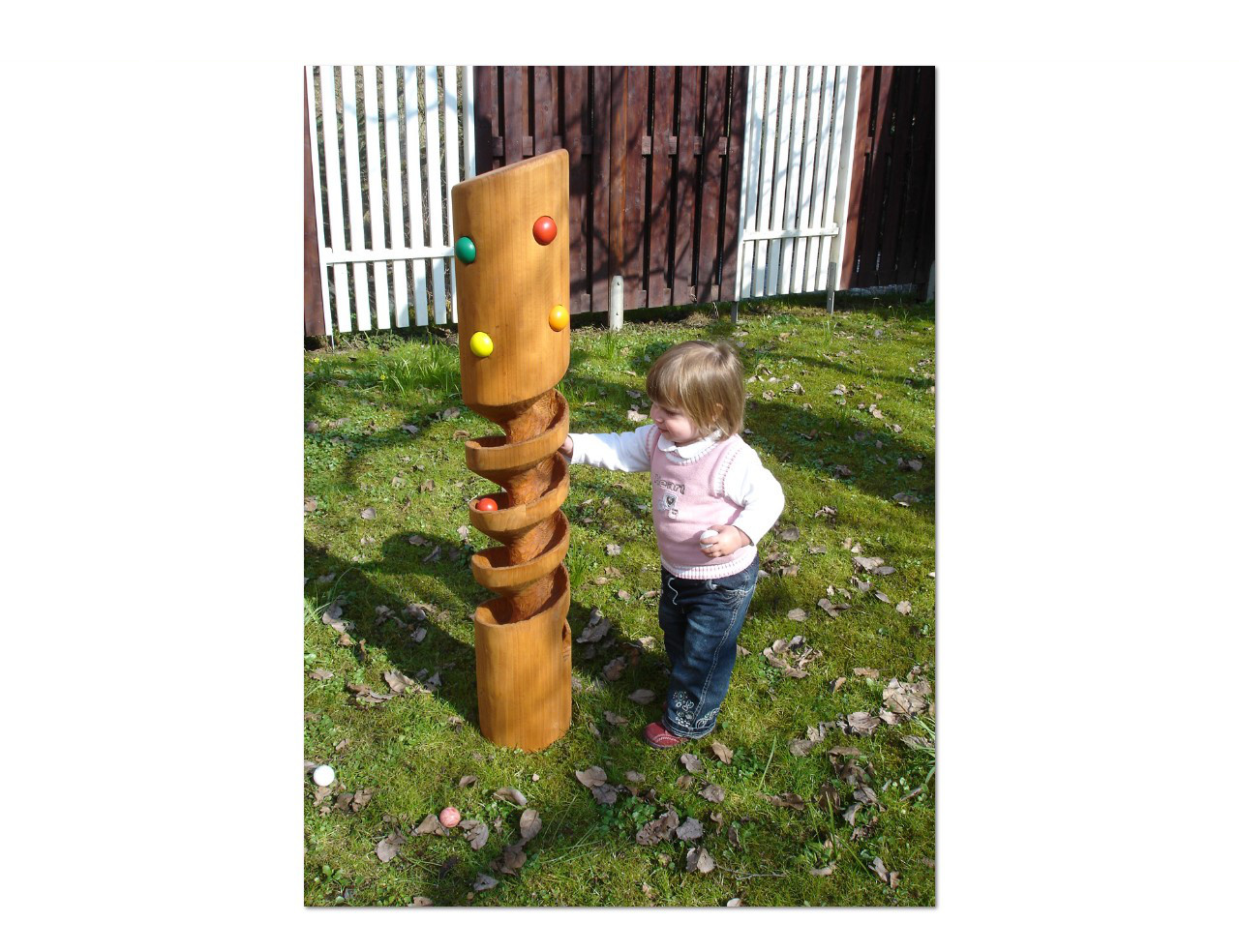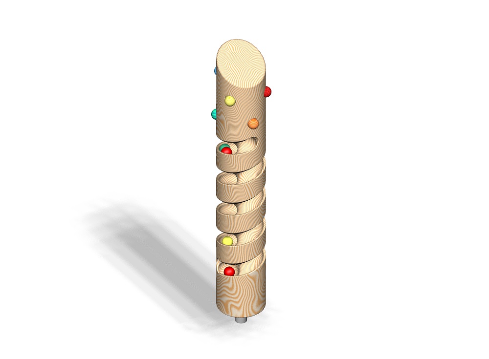 Spielobjekt mit Pfosten aus Douglasie-Rundholz ø 20 cm, kerngetrennt, verleimt, zylindrisch gefräst lasiert, mit eingefräster wendelförmiger Kugelbahn, Kopf abgeschrägt, oben halb eingelassene Signalkugeln in den Farben des Regenbogens (rot, orange, gelb, grün, hellblau, blau, violett), inkl. eingebohrtem Pfostenanker aus verzinktem Stahlrohr.